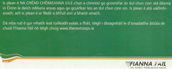 The generic Fianna Fail leaflet that went through the doors at election time throughout the country for the 2007 General Election. Here we have Brian Lenihan and Gerry Lynam running for Fianna Fail in Dublin West. Little or no detail about the candidates. A letter from Bertie Ahern telling us about the Next Steps.
