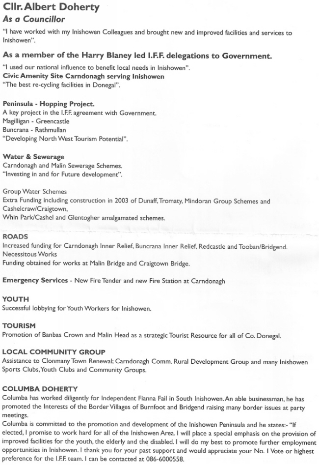 From the 2004 Local Elections in Donegal, Independent Fianna Fail candidates Albert Doherty and Columba Doherty. Neither were elected.