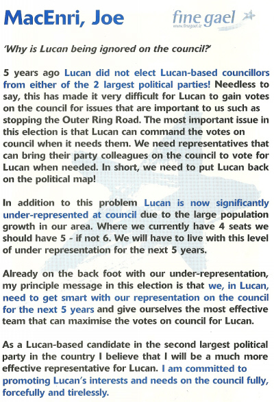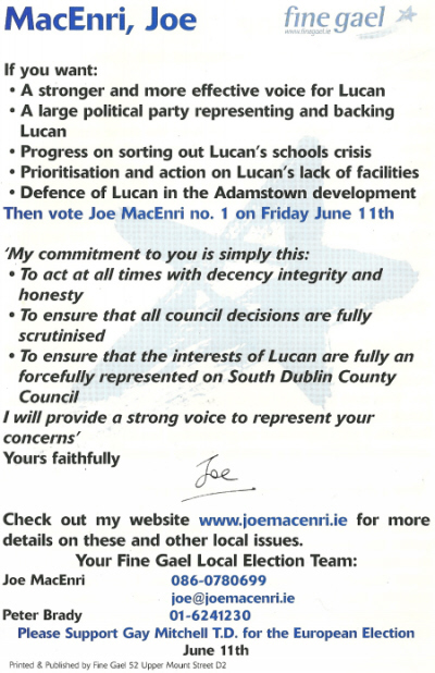 From the 2004 Local Elections Fine Gael candidate Joe MacEnri running in the Lucan LEA. He wasn’t elected.