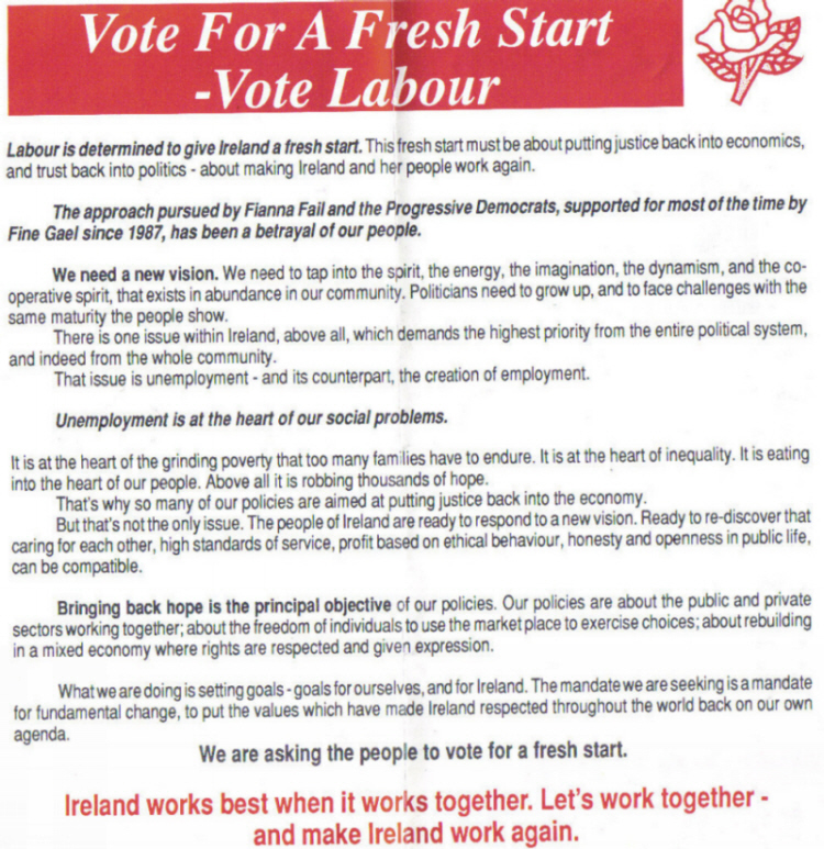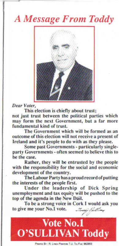 From the 1989 General Election, a leaflet from Labour candidate Toddy O’Sullivan running in Cork South Central.