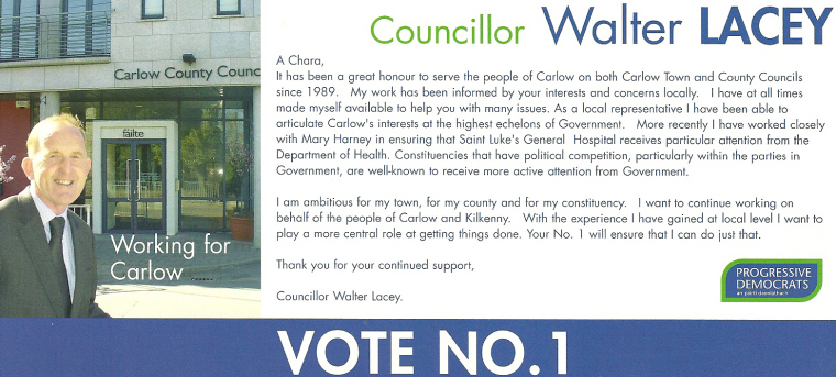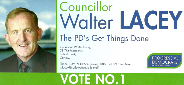 From the 2007 General Election in Carlow -Kilkenny Progressive Democrat candidate Walter Lacey. Carlow based Walter Lacey polled 1,073 votes and failed to be elected.