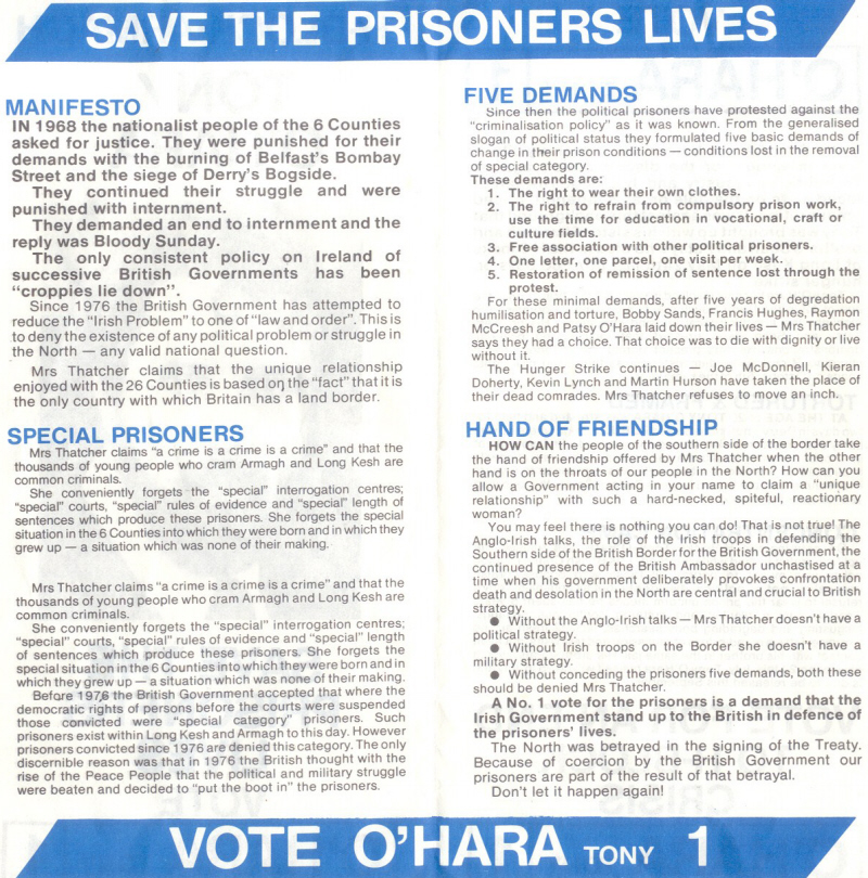[…] From 1981 the election leaflet of H-Block candidate Tony O’Hara (Brother of Patsy) who ran in Dublin West. […]