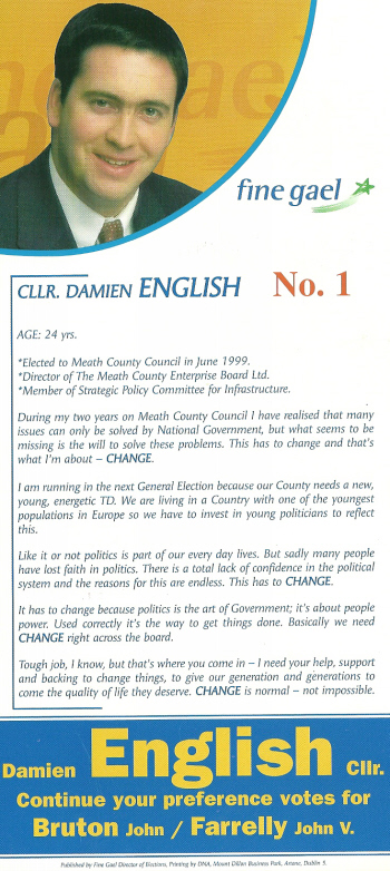 From the 2002 General Election, Fine Gael candidate Damien English running in Meath. Damien English was elected, unseating party colleague John V Farrelly in the process. Damien English was returned again in 2007 for the new Meath West constituency.