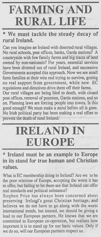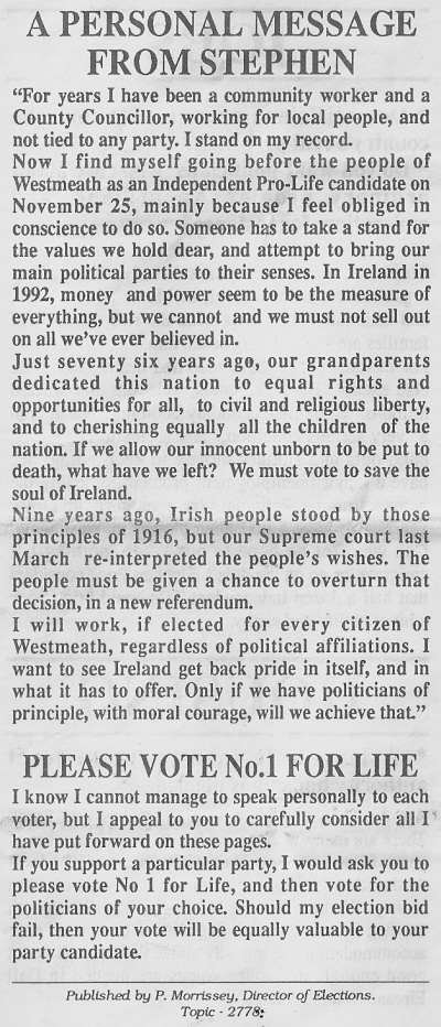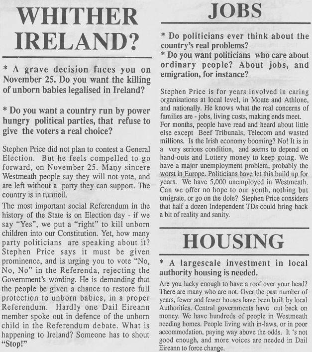 From the 1992 General Election in Westmeath, Independent candidate Stephen Price.