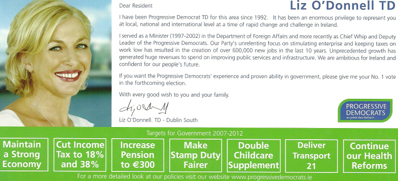 From the 2007 General Election campaign in Dublin South, a rather airbrushed Progressive Democrat candidate Liz O’Donnell.