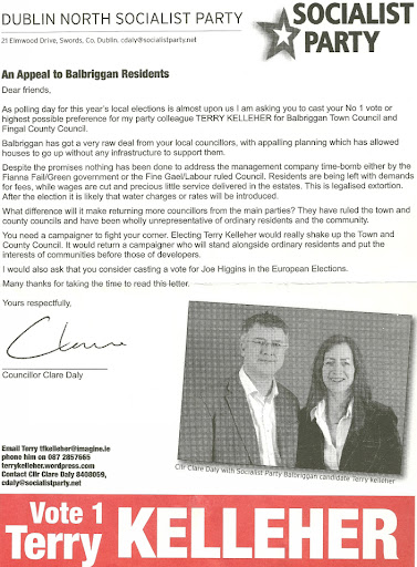 From the 2009 Local Elections a letter from councillor Clare Daly urging voters to vote for The Socialist Party candidate Terry Kelleher in Balbriggan. She also asks voters to vote for Joe Higgins in the European Elections.