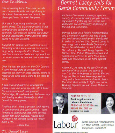 From the 1999 Local Elections in the Pembroke ward, Labour Party candidate Dermot Lacey. Dermot Lacey was elected.