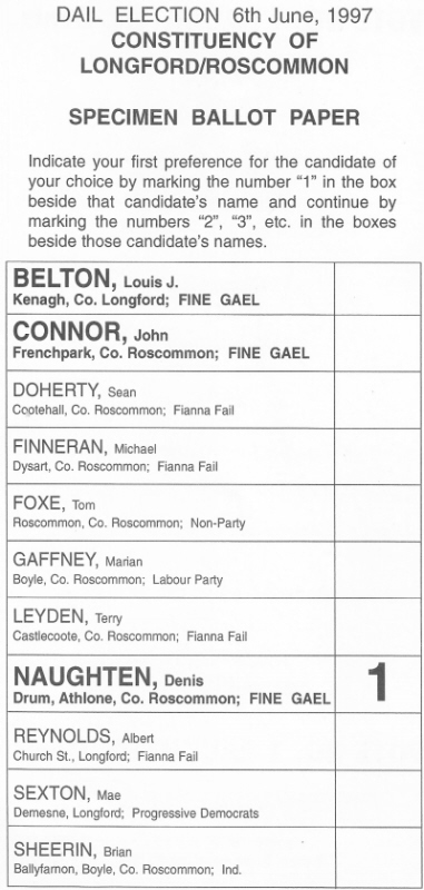 From the 1997 General Election the then 24 year old Senator Denis Naughten running for Fine Gael in Longford-Roscommon. He was comfortably elected , as he has been since.