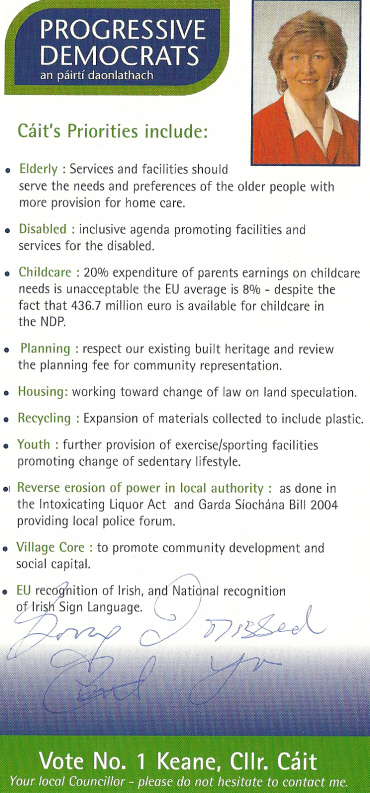 From the 2004 Local Elections Progressive Democrat Candidate Cait Keane running in the Terenure-Rathfarnham Ward.