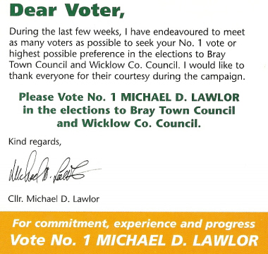 From the 2009 Local Elections, Fianna Fail candidate Michael D Lawlor running in Bray, co Wicklow.