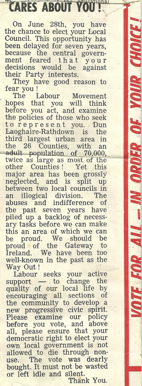 Bernard Connolly, Vincent MacDowell, Joseph Maguire, Gerard O’Reilly- Labour Party- 1967 Local Elections Rathdown » 1967b