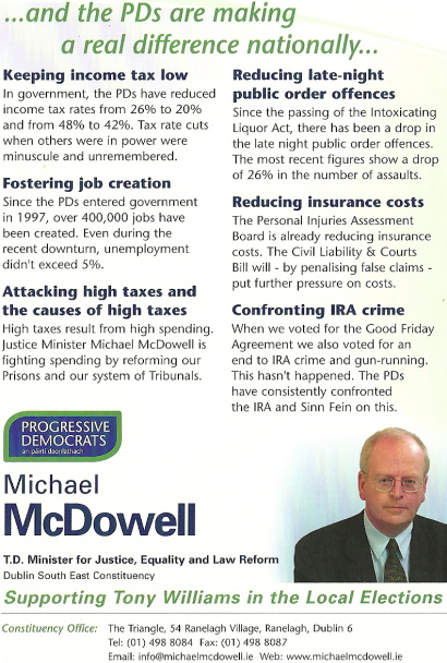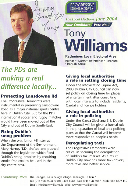From the 2004 Local Elections, Progressive Democrat candidate Tony WIlliams running in the Rathmines Ward.