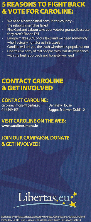 From the 2009 European Elections campaign in Dublin, a flyer for Libertas candidate Caroline Simons.