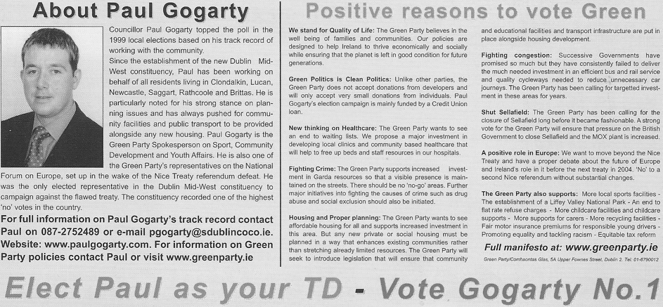 From the 2002 General Election a leaflet from Green Party Candidate Paul Gogarty. Gogarty was elected for the first time to the Dail.