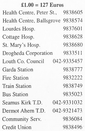 From the 1999 Local Election in Drogheda a Sorry I missed you card from Fianna Fail candidate Michael Coyle. On the reverse are the usual array of local emergency contact numbers as well as the pound euro conversion rate and the numbers of Seamus Kirk and Dermot Ahern.