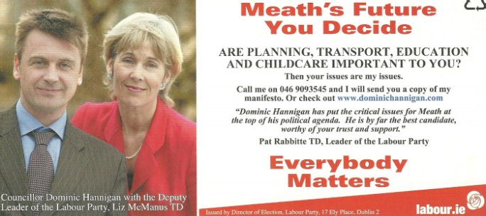 From the 2005 Meath by Election a flyer for Labour candidate Dominic Hannigan. Hannigan polled 5567 votes and failed to win the seat.