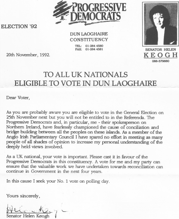 To All UK Nationals Eligible to Vote in Dun Laoghaire -Helen Keogh -Progressive Democrats -1992 GE » hkeoghuknationals92