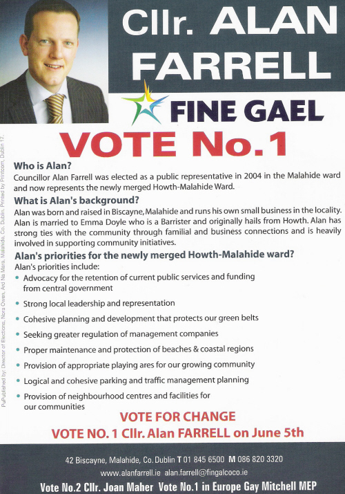 From the 2009 Local Elections a leaflet for Fine Gael candidate Alan Farrell running in the Howth-Malahide ward. Initially elected in 2004 , Alan Farrell comfortably held onto his seat on Fingal County Council in 2009.