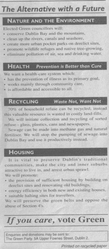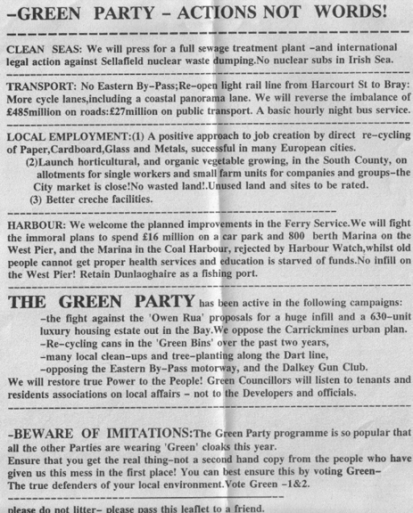 From the 1991 Local Elections, Green Party candidates in the Ballybrack Ward, Maggie Blake and Vincent Treanor. Despite polling well neither were elected. It was the only time either stood for election for the Greens.