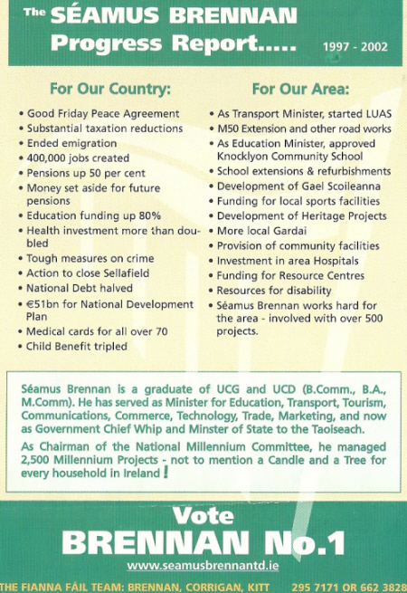 From the 2002 General Election a flyer for the Late Seamus Brennan running for Fianna Fail in Dublin South. Seamus Brennan topped the poll and was elected on the first count.