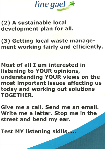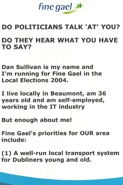 From the 2004 Local Elections a leaflet from Fine Gael candidate (and now well known blogger) Dan Sullivan.
