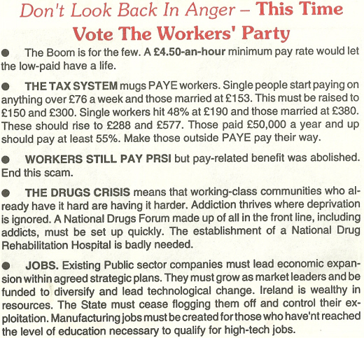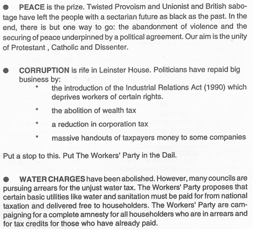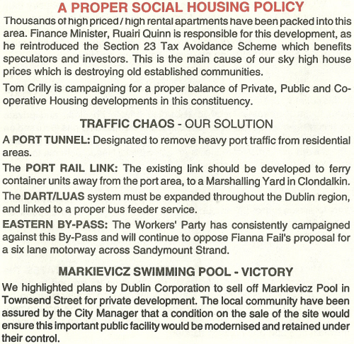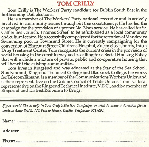 1. […] The Workers Party (WP): Catherine Murphy – General Election – Kildare (1989) * The Workers Party (WP): Tom Crilly – GE Dublin South East […]