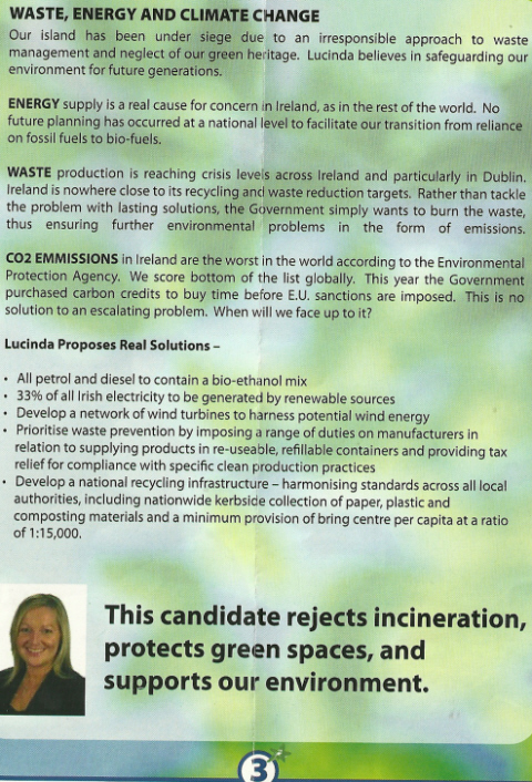 This candidate rejects incineration, protects our Green spaces and supports our environment. proclaims Lucinda.