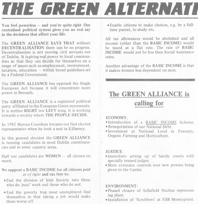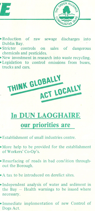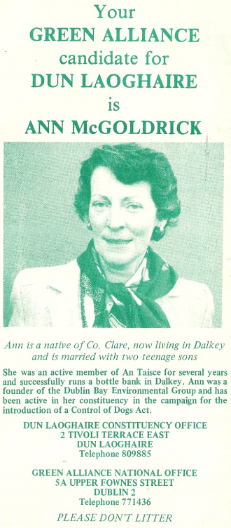 From the 1987 General Election, Green Party candidate Ann McGoldrick running in Dun Laoghaire. She polled 929 votes.