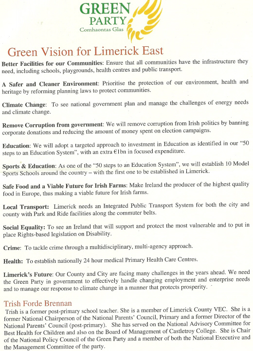 From the 2007 General Election in Limerick East, a leaflet produced by Green Party candidate Trish Forde Brennan. She polled 1296 votes.