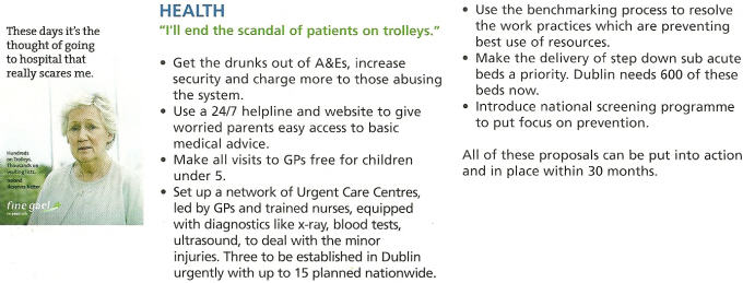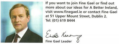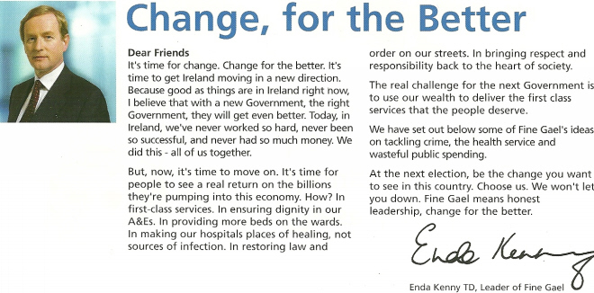 From the 2007 General Election a Fine Gael leaflet with a message from Enda Kenny on ‘Change, for the Better’ . The Leaflet concentrates on the worries about Crime , Health and the Waste of Taxpayers money.
