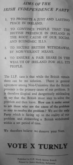 […] 1979 in North Antrim a leaflet for John Turny of The Irish Independence Party. Briefly the Party was a destination for Republican voters before Sinn Fein came into the electoral […]