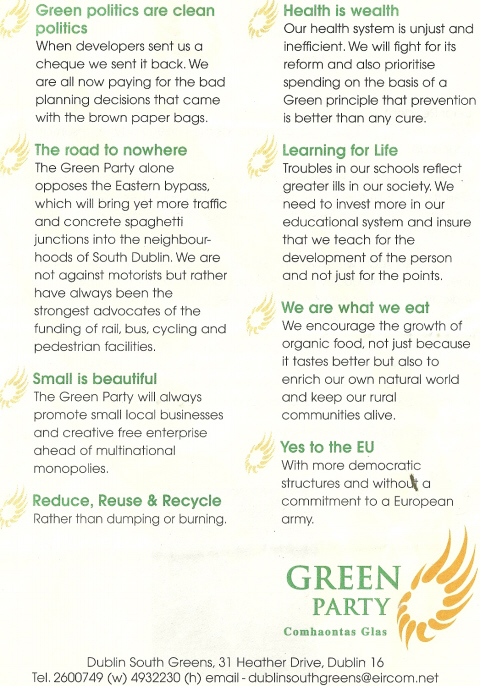 A 2001 leaflet where the then Green Party Councillor Eamon Ryan introduces himself to the voters of Dublin South. Ryan was initially elected as a Councillor for the Rathmines Ward in 1999 (I think he was co-opted onto the council prior to that) and was then switched to Dublin South in the run up to the 2002 General Election.