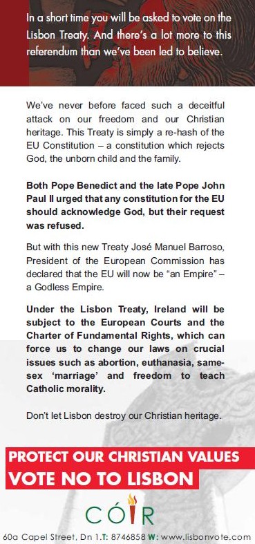 ‘A Godless Empire’ -‘Protect Our Christian Values’ – Vote No To Lisbon -Coir Leaflet from first Lisbon Referendum » godless2