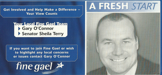 From the 2004 Local Elections, a simple leaflet for Fine Gael candidate Gary O’Connor running in Mulhuddart. He failed to win a seat.