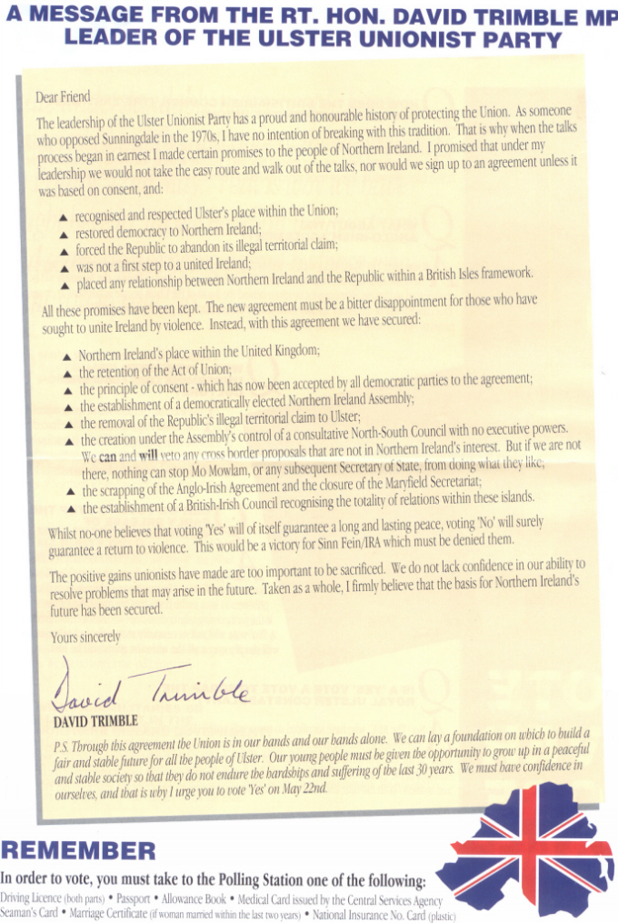 ‘Say Yes For The Union’ -Ulster Unionist Party Good Friday Agreement Leaflet » UUPGFA2