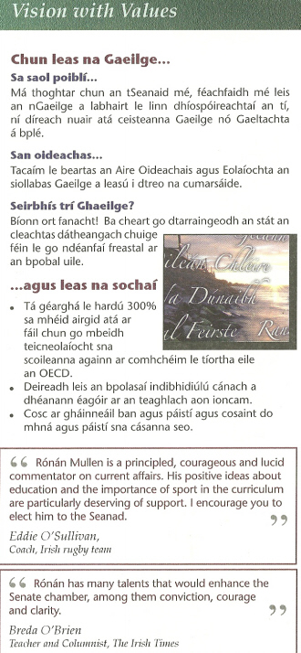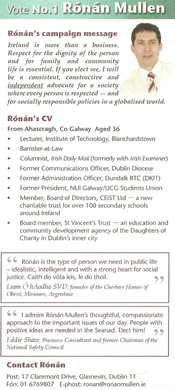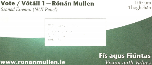 From the 2007 NUI Seanad election a leaflet for Independent Senator Rónán Mullen. Rónán Mullen was elected.