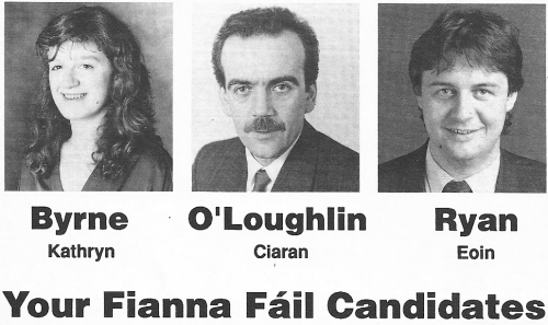 From the 1991 Local Elections a simple flyer for Fianna Fail candidates in the Pembroke Ward Kathryn Byrne, Ciaran O’Loughlin and Eoin Ryan. Eoin Ryan was elected.