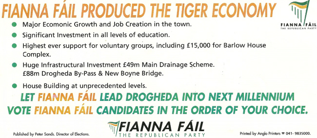 from the 1999 Local Elections a flyer for Fianna Fail candidates Lynda Gibney and Tommy Murphy running for Drogheda Corporation. Tommy Murphy was elected.
