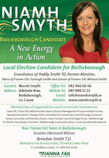 From the 2009 Local Elections a leaflet for Fianna Fail candidate Niamh Smyth running in Bailieborough. She topped the poll.