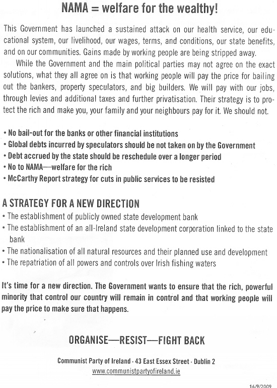 NAMA = welfare for the wealthy! -Leaflet from the Communist Party of Ireland 2009 » namawfw1