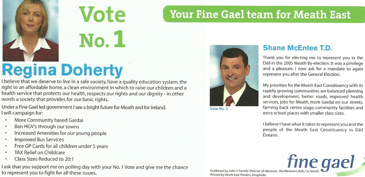 From the 2007 General Election a leaflet fro Fine Gael candidate Regina Doherty running in Meath East. She polled well but missed out on a seat.