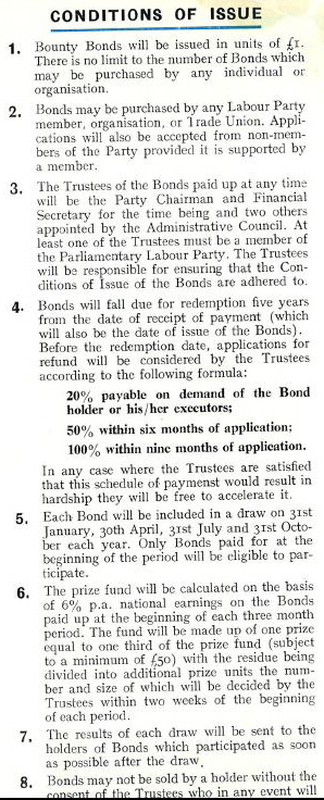 The aim of the Bonds were to “Help build a Strong Labour Party by supplying it with the sinews of war for the vital years up to the next General Election.”