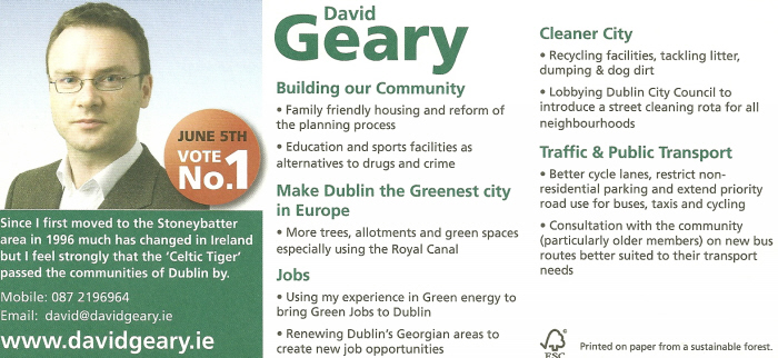 ‘The Recovery is Green’ writes Green Party candidate for the 2009 Dublin Central by-election David Geary. In a constituency not known for a large Green Vote, Geary polled 819 votes as Maureen O’Sullivan won the seat. Geary also stood in the Local Elections in The North Inner City ward, where he polled 519 votes and failed to get in.