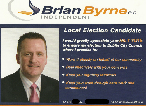 From the 2009 Local Elections a leaflet for Former Fianna Fail councillor Brian Byrne running as an Independent in Donaghmede.