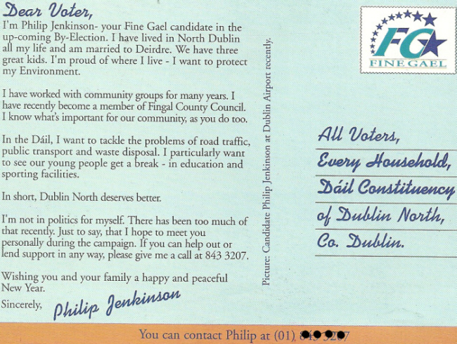 From the 1998 Dublin North By-Election, a flyer for the Fine Gael Candidate Philip Jenkinson. He polled 3,185 votes in a contest won by Labours Sean Ryan.