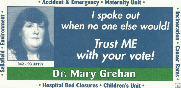From the 2002 General Election a flyer for the Late Mary Grehan running as an Independent in Louth where she polled 2,384 votes. A prominent Anti-Sellafield campaigner and well known GP in Dundalk, Mary Grehan had run for the PDs in 1997. For many years she was a member of both Louth County Council and Dundalk Town Council.