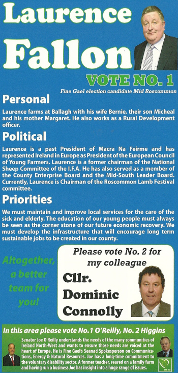 From the 2009 Local Elections a flyer for Fine Gael candidate Laurence Fallon running for Roscommon County Council.