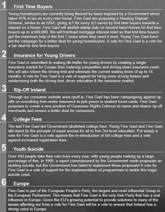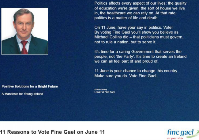 Included are a message from Enda Kenny and also “11 Reasons to Vote Fine Gael on June 11”.