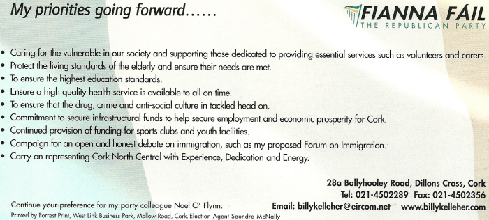 Flyer for Billy Kelleher -Fianna Fail – Cork North central 2007 General Election » bkelleher07b