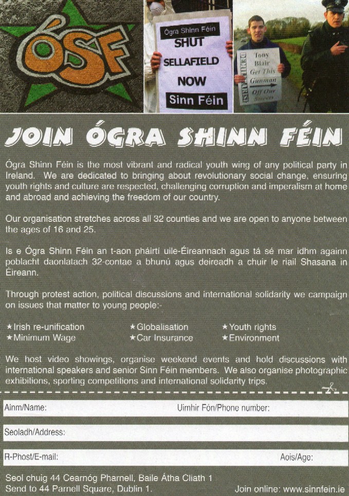 Ógra Shinn Féin recruitment leaflet from 2005 » OSFRecruitmentFront05